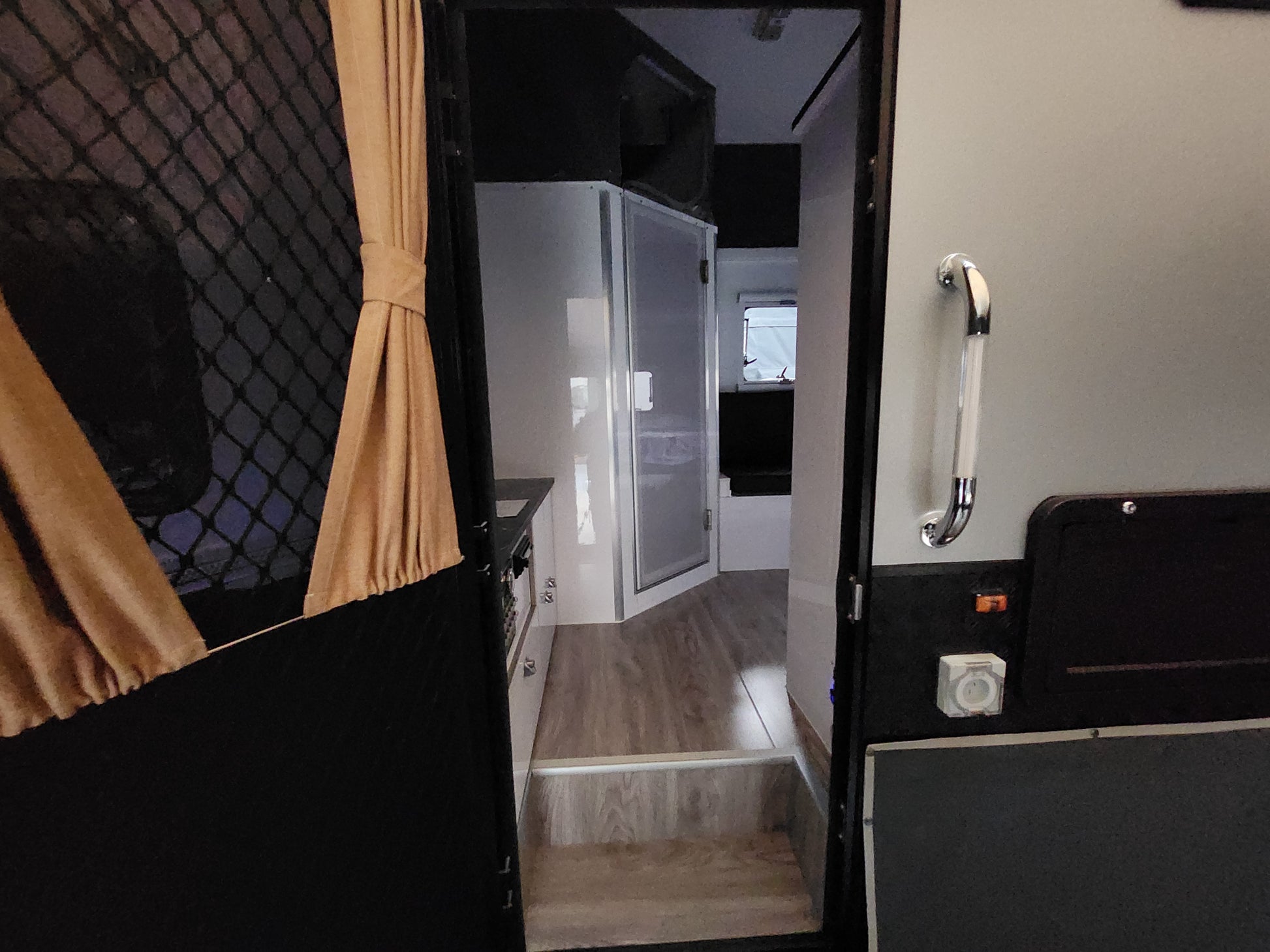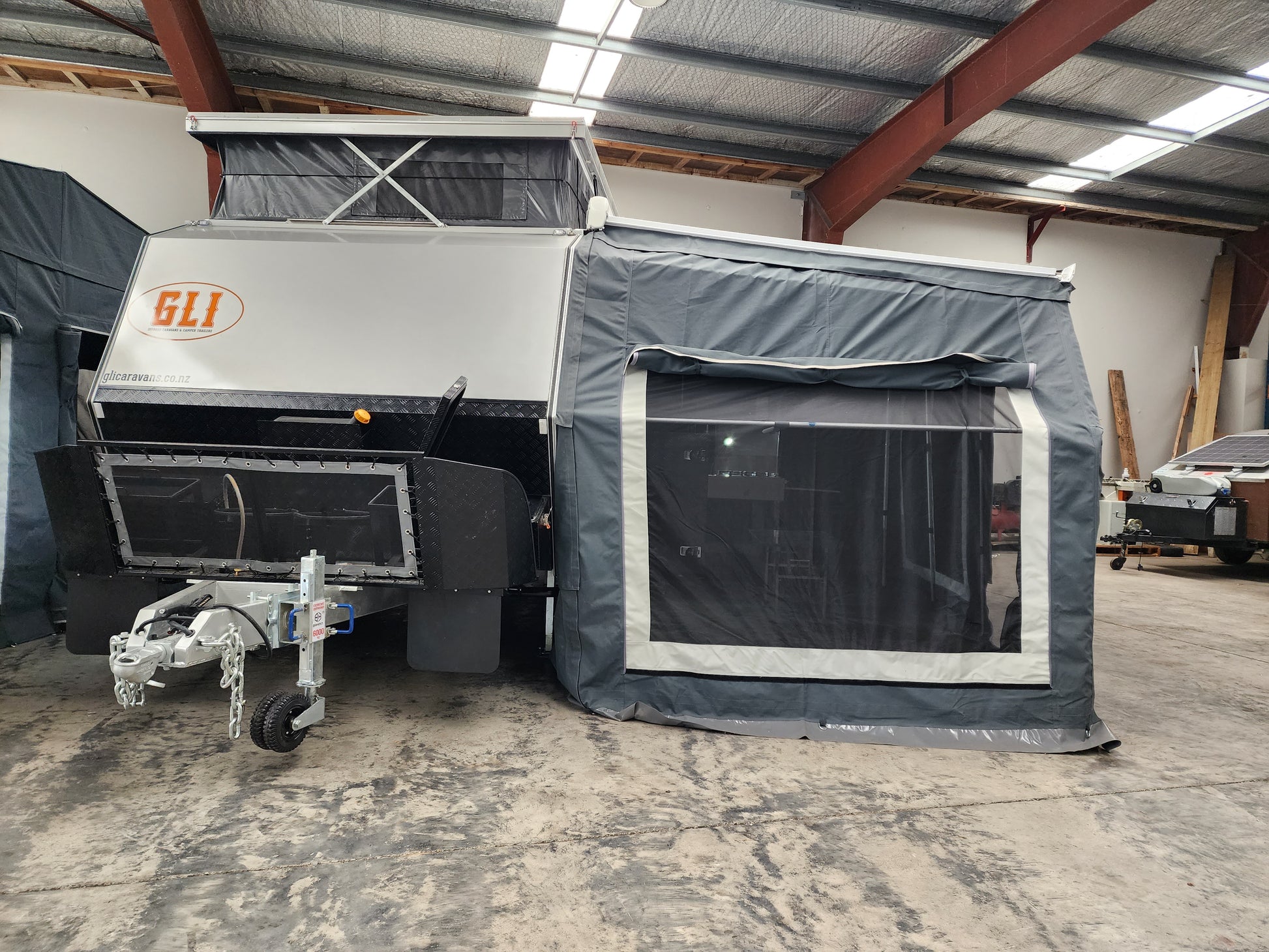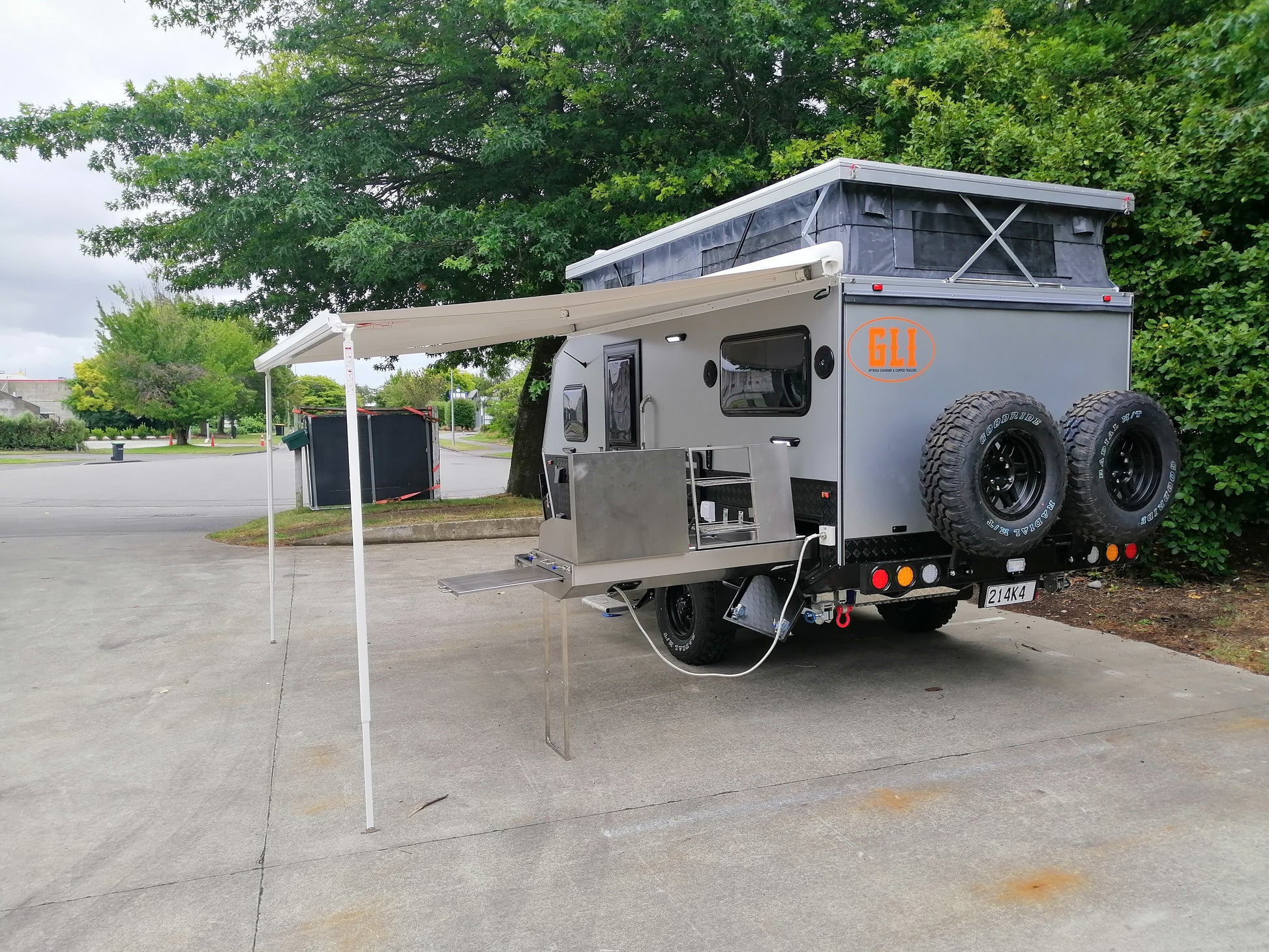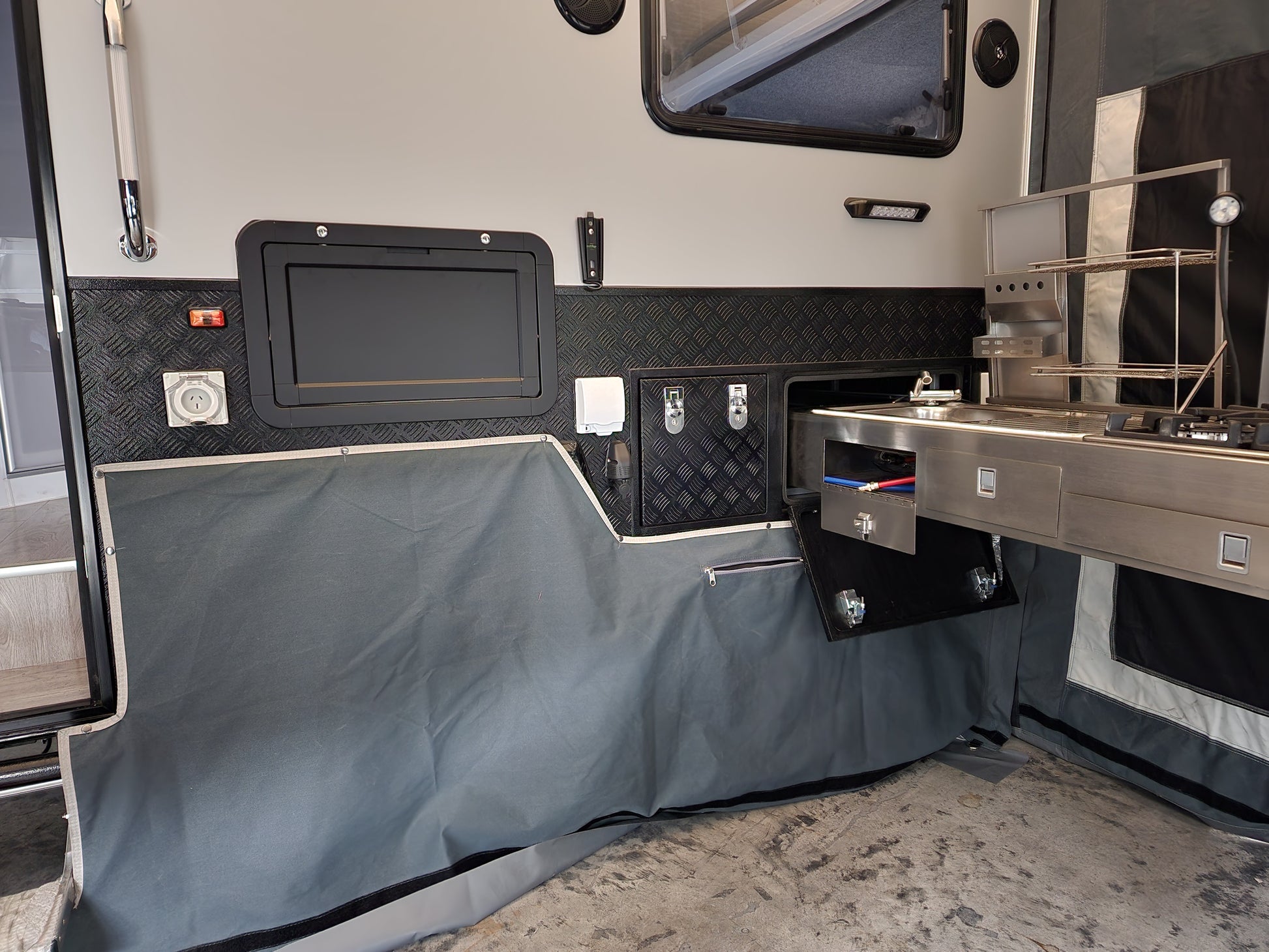 | KITCHEN CONSTRUCTION | External slide out stainless-steel kitchen with sink, draining board, prep bench, 4 burner gas stove and 3-sided wind deflector. |